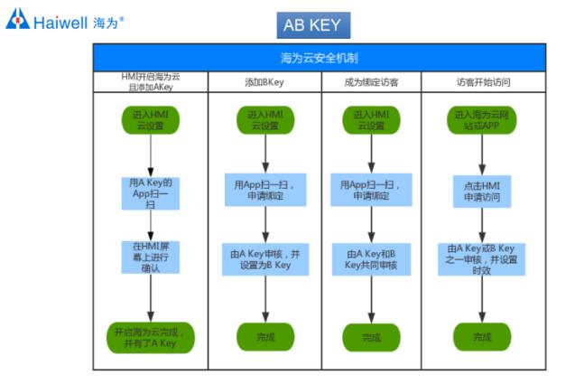 在該安(an)全(quan)(quan)方(fang)案中,用(yong)戶(hu)需設置HMI或(huo)SCADA 的(de)(de)(de)(de)A Key賬(zhang)號才能開啟云訪(fang)(fang)問(wen),同時為方(fang)便管理,可(ke)設定多個B Key賬(zhang)號協助A Key賬(zhang)號管理設備(bei),任何訪(fang)(fang)客(ke)想綁定設備(bei),需征(zheng)得A key和B Key的(de)(de)(de)(de)同意,且每次訪(fang)(fang)問(wen),A key和B Key都可(ke)限(xian)制(zhi)(zhi)訪(fang)(fang)客(ke)通過(guo)指定的(de)(de)(de)(de)手機(ji)或(huo)電(dian)腦,訪(fang)(fang)問(wen)到HMI/SCADA的(de)(de)(de)(de)運行工程畫面和控制(zhi)(zhi),并對其設置允許訪(fang)(fang)問(wen)的(de)(de)(de)(de)時長。即便A/B Key其中一方(fang)的(de)(de)(de)(de)帳(zhang)(zhang)戶(hu)密碼泄露(lu),另一個帳(zhang)(zhang)戶(hu)也同樣能保障設備(bei)的(de)(de)(de)(de)安(an)全(quan)(quan)。雙 Key的(de)(de)(de)(de)審核機(ji)制(zhi)(zhi)安(an)全(quan)(quan)級別更高。