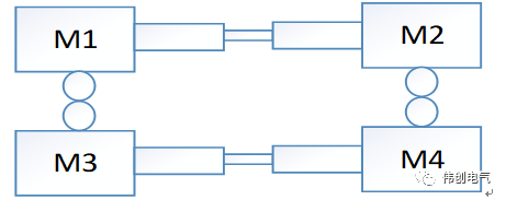 以下為(wei)某現場攪(jiao)(jiao)拌(ban)機(ji)(ji)的運用,我(wo)司變頻器采用一主(zhu)三從(cong)方式來控制4臺(tai)(tai)(tai)電(dian)機(ji)(ji)同(tong)步(bu)運行,從(cong)而實現攪(jiao)(jiao)拌(ban)功能;該攪(jiao)(jiao)拌(ban)機(ji)(ji)動力(li)部分由4臺(tai)(tai)(tai)電(dian)機(ji)(ji)組成,其(qi)結構如圖(tu)所示(shi):電(dian)機(ji)(ji)M1、M2為(wei)同(tong)軸(zhou)(zhou)剛性;M3、M4為(wei)同(tong)軸(zhou)(zhou)剛性連(lian)(lian)接;M1與M3,M2與M4有同(tong)步(bu)齒(chi)輪剛性連(lian)(lian)接(即4臺(tai)(tai)(tai)電(dian)機(ji)(ji)之間兩兩剛性連(lian)(lian)接,驅動其(qi)中一臺(tai)(tai)(tai)電(dian)機(ji)(ji)其(qi)他3臺(tai)(tai)(tai)電(dian)機(ji)(ji)都(dou)可(ke)以聯動)。