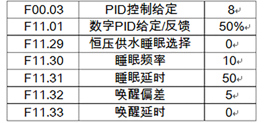 7、 設置F11.32喚醒偏差;(當PID給定—喚醒偏差>PID反饋時,將停止休眠, 會啟動)。