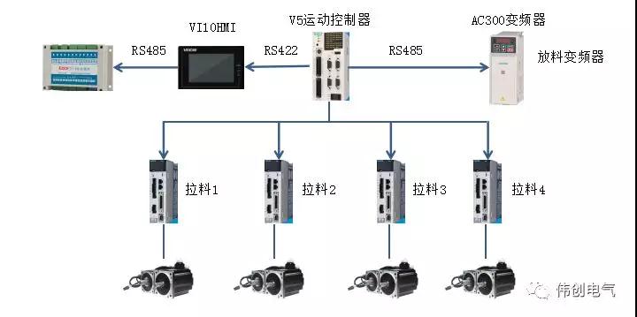 (1)采用偉創(chuang)高(gao)性能V5-MC104運動控(kong)制器(qi)作為上(shang)位(wei)控(kong)制,輸(shu)(shu)出脈沖對4臺拉料伺(si)服進行位(wei)置(zhi)控(kong)制,V5具有(you)獨特的4軸口高(gao)速輸(shu)(shu)出設計,最高(gao)輸(shu)(shu)出頻(pin)率(lv)3MHz,軸口與SD700系列伺(si)服有(you)單獨專用連接線(xian),無需外部接線(xian),安裝(zhuang)簡(jian)單方便(bian);
