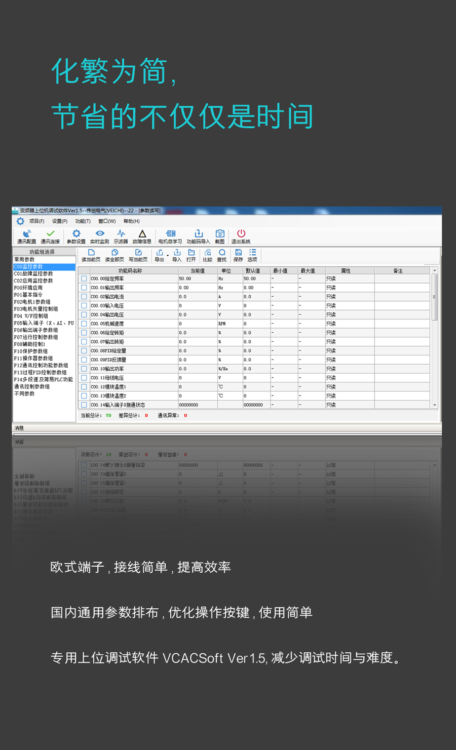 可上傳和下傳變頻器的(de)功能(neng)代碼信(xin)息,實現快(kuai)速參數(shu)復制 |