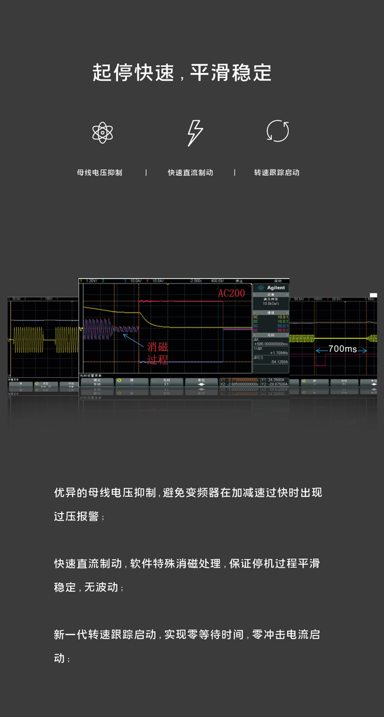 瞬時(shi)掉電(dian)時(shi),通過母線電(dian)壓控制,實現不間斷(duan)運行(xing) |