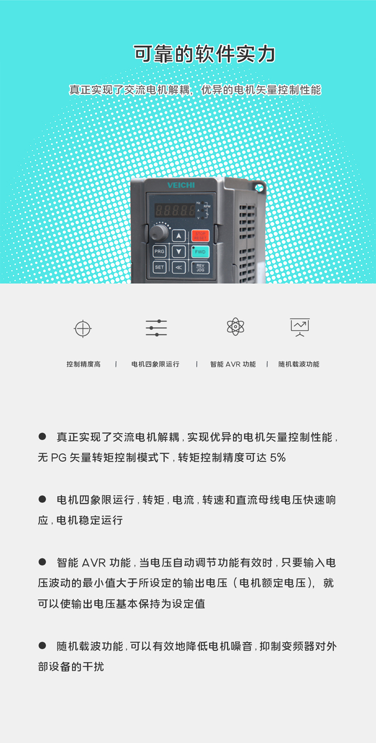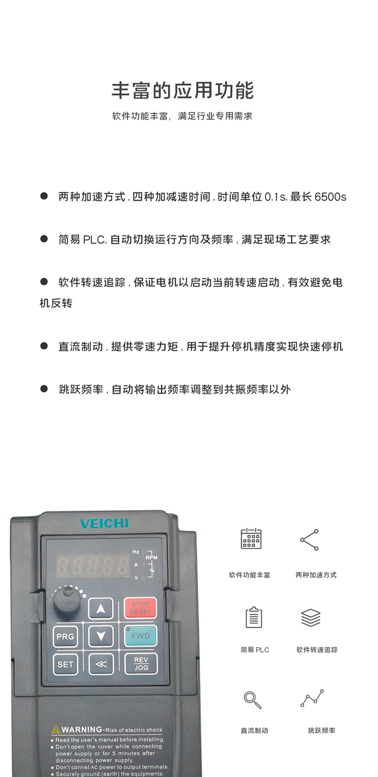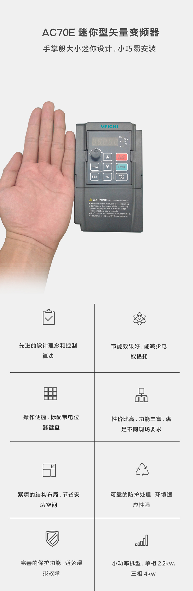 AC70E系列(lie)變頻(pin)器是(shi)我司針(zhen)對小功(gong)(gong)率,小體積(ji),低成本(ben)的市場(chang)需求,所研制出來(lai)的一款迷你型(xing)變頻(pin)器,包括有單相220VAC和三相380VAC機型(xing),產品(pin)具有先進的控制方式,實現了高轉矩、高精度、高可靠性、寬調速驅動。產品(pin)內置(zhi)簡易PLC、PID調節、可編(bian)程輸(shu)入輸(shu)出端(duan)子(zi)、RS485接口、模擬量輸(shu)入輸(shu)出等多種(zhong)豐富的控制功(gong)(gong)能,特別適合(he)一些小功(gong)(gong)率電機生產場(chang)合(he)。