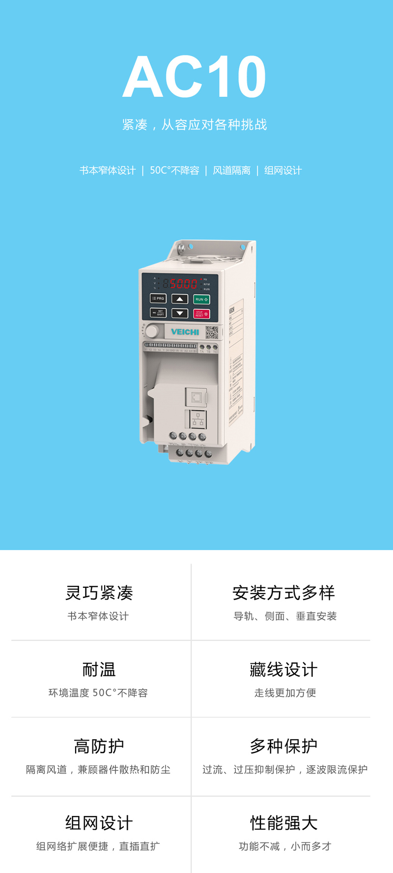 AC10系(xi)列變(bian)頻器(qi)(qi)是在偉(wei)創電氣新技術(shu)平臺上開發出來的(de)一(yi)(yi)款(kuan)產(chan)品(pin)。 AC10產(chan)品(pin)基于用戶對小型化、高(gao)可(ke)靠(kao)性、高(gao)性價比(bi)的(de)市場需求。作為一(yi)(yi)款(kuan)書(shu)本窄體變(bian)頻器(qi)(qi),AC10具(ju)備(bei)安裝便(bian)捷、體積小、溫升低(di)、高(gao)防護、強(qiang)大的(de)軟件性能等諸多優點。 AC10開發全過(guo)(guo)程依(yi)托先(xian)進PLM研(yan)發管理系(xi)統,保(bao)證(zheng)開發過(guo)(guo)程中(zhong)硬(ying)件、軟件、結(jie)構(gou)、測試過(guo)(guo)程立體化、系(xi)統化、可(ke)追溯,在每一(yi)(yi)個細節上都不斷的(de)推敲。保(bao)證(zheng)產(chan)品(pin)嚴(yan)謹性、科學性(僅T3機(ji)器(qi)(qi)支(zhi)持矢(shi)量控制(zhi))。