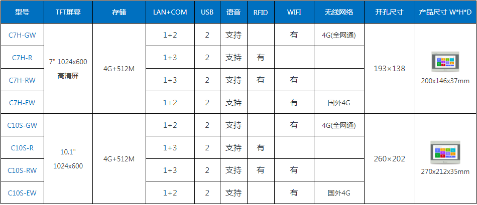 海為C系列物聯云HMI型號列表